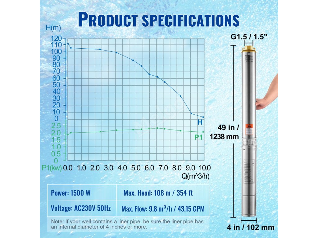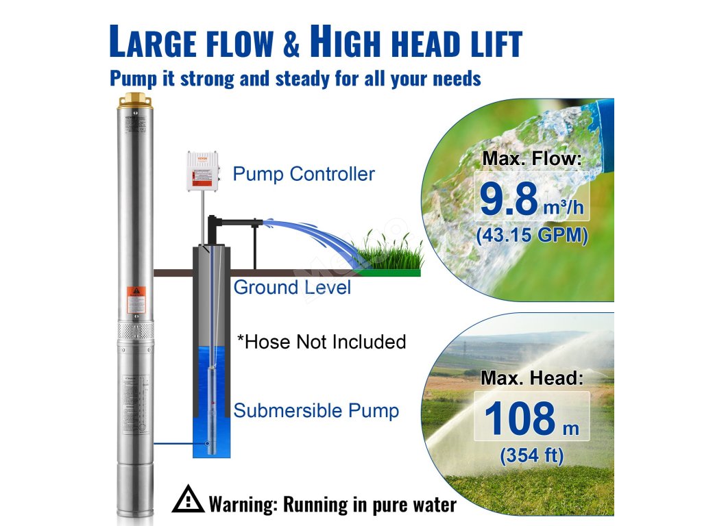 Toto 1500W ponorné čerpadlo do studny má vysoký průtok 9,8 m³/h a vysoký výtlak 108 m, takže uspokojí všechny vaše potřeby vody. Vícenásobná filtrační síť zajišťuje křišťálově čistou vodu.
