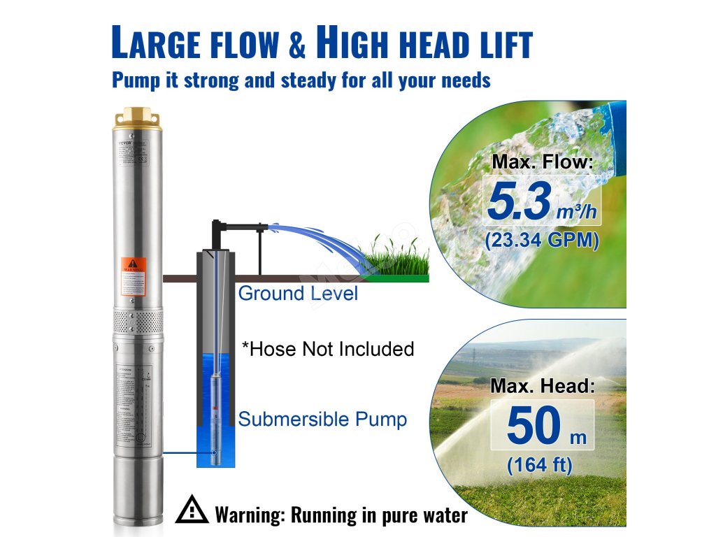 Ponorné vodní čerpadlo pro hluboké studny můžete instalovat vertikálně nebo horizontálně. Čerpadlo ponořte zcela do vody, abyste se vyhnuli dlouhému chodu naprázdno.