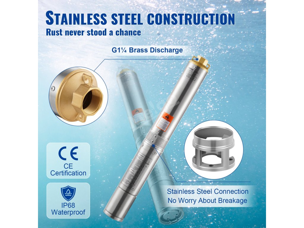 Zesílená konstrukce z nerezové oceli činí z tohoto čerpadla do hlubokých studní vynikající volbu, která vám zajistí ochranu před korozí, rzí a poruchami.