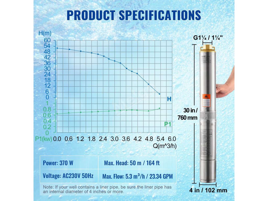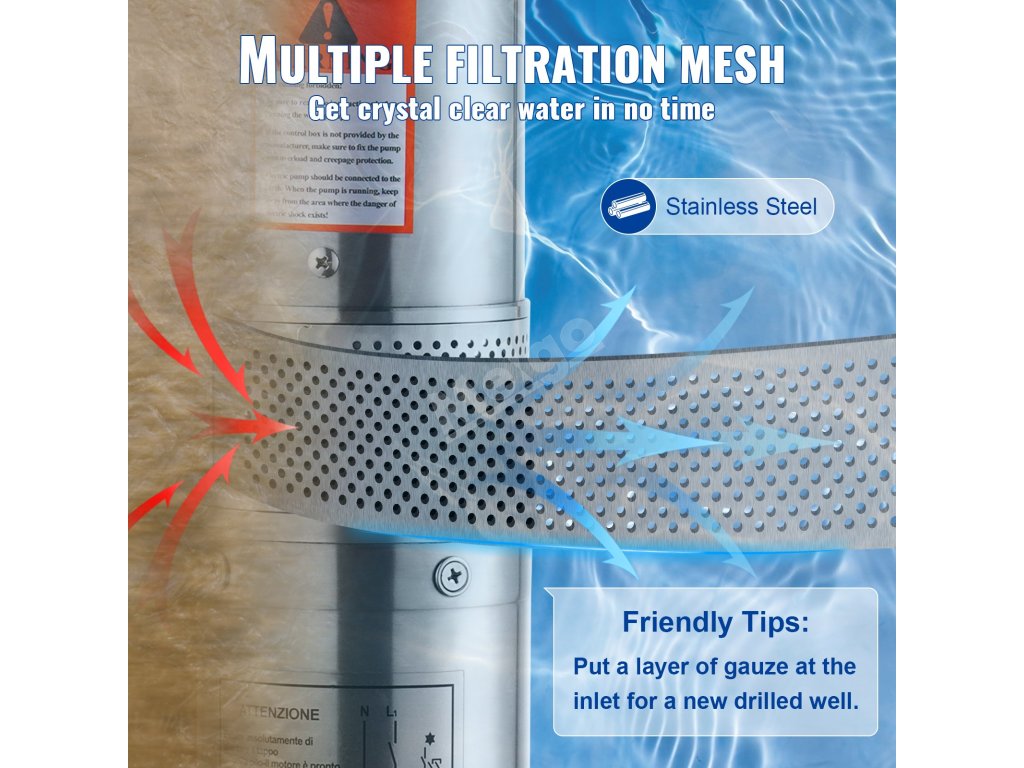 Toto ponorné čerpadlo do studny s příkonem 370 W má vysoký průtok 5,3 m³/h a vysoký výtlak 50 m, takže uspokojí všechny vaše potřeby vody. Vícenásobná filtrační síť zajišťuje křišťálově čistou vodu.