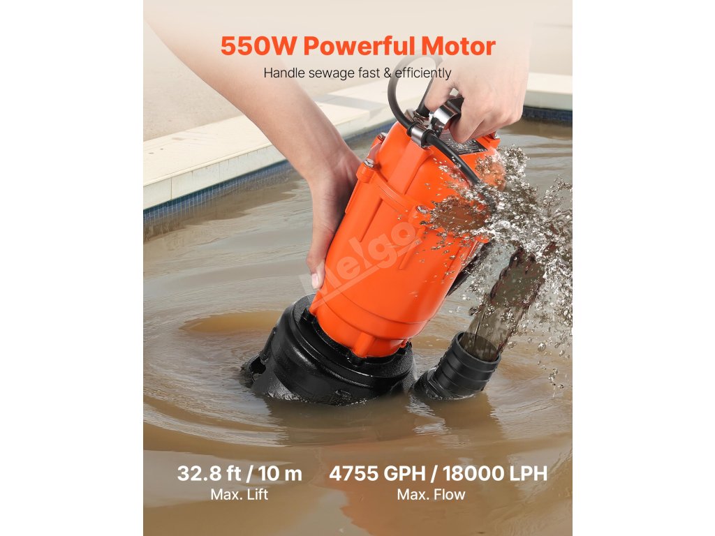 Toto 550W (3/4 HP) kalové čerpadlo s maximálním průtokem 18 000 l/h (4755 GPH) a maximálním výtlakem 10 m vám pomůže zvládnout náročné úkoly spojené s likvidací odpadních vod. Litinové pouzdro a vodotěsnost IPX8 pro spolehlivý ponorný výkon. Ideální pro vypouštění bazénů, rybníků, farem atd.