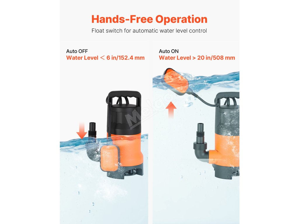 Plovákový spínač automaticky zapíná a vypíná toto ponorné kalové čerpadlo podle výšky hladiny vody bez nutnosti neustálého sledování. Přenosná rukojeť usnadňuje přepravu, zatímco dlouhý napájecí kabel umožňuje flexibilní umístění pro bezproblémovou likvidaci znečištěné vody.