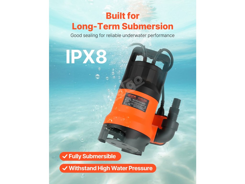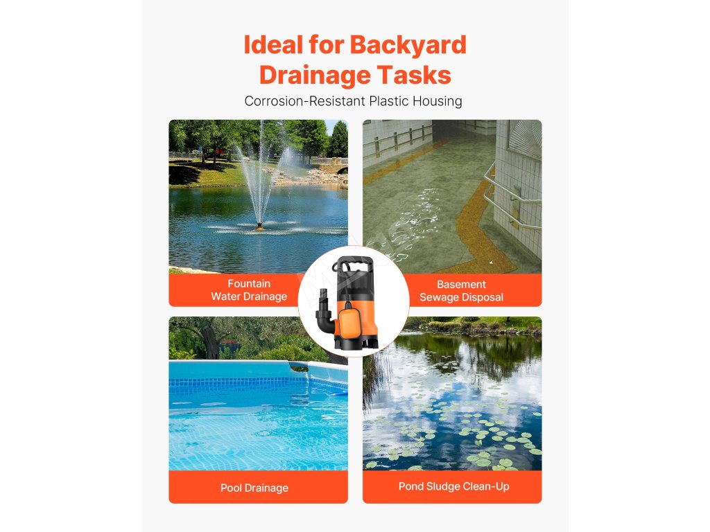 Toto 650W (0,87 HP) kalové čerpadlo poskytuje maximální průtok 15 000 l/h (3963 GPH) a maximální výtlak 8 m. Díky plastovému krytu odolnému proti korozi, vodotěsnosti IPX8 a plovákovému spínači zajišťuje vysoký výkon při ponoření. Zvládne náročné práce při vypouštění bazénů, rybníků apod.