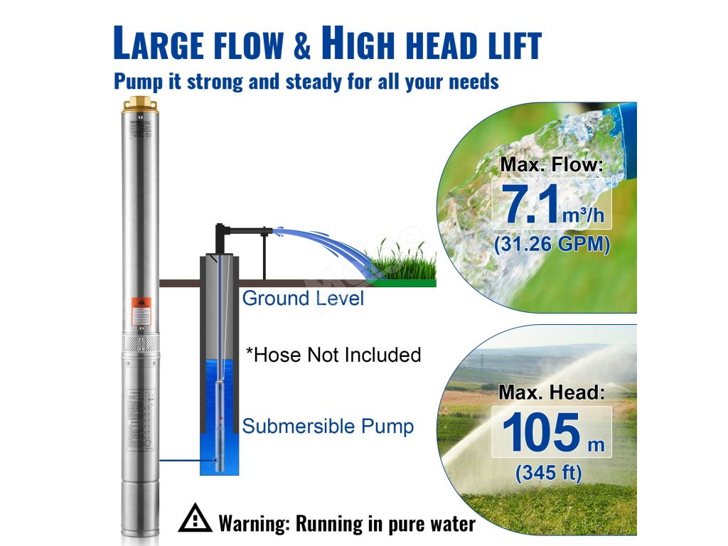 Ponorné vodní čerpadlo pro hluboké studny můžete instalovat vertikálně nebo horizontálně. Čerpadlo ponořte zcela do vody, abyste se vyhnuli dlouhému chodu naprázdno.