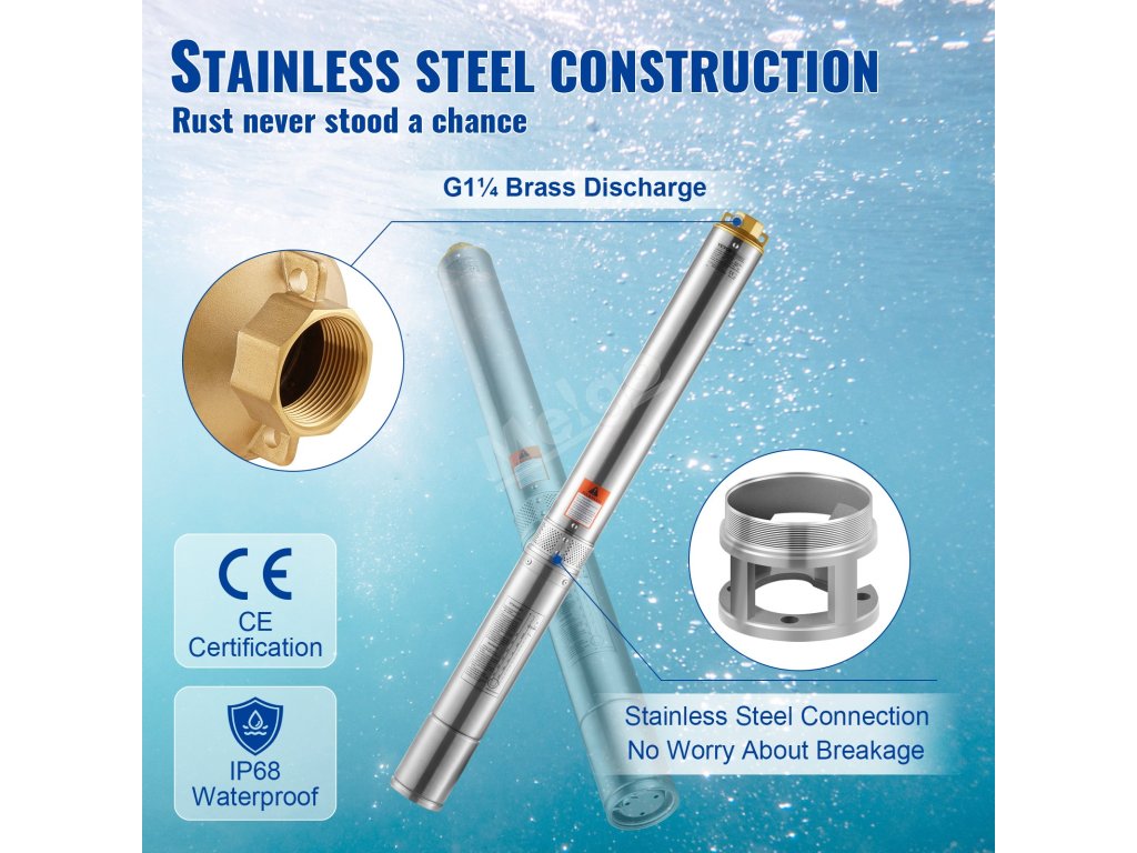 Zesílená konstrukce z nerezové oceli činí z tohoto čerpadla do hlubokých studní vynikající volbu, která vám zajistí ochranu před korozí, rzí a poruchami.
