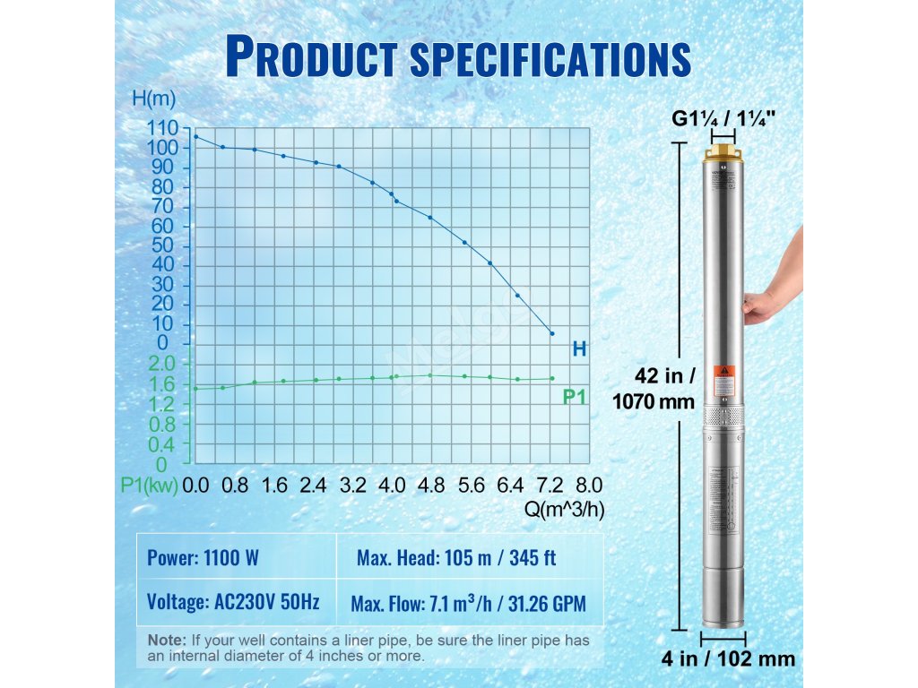 Toto ponorné čerpadlo do studny o příkonu 1100 W má vysoký průtok 7,1 m³/h a vysoký výtlak 105 m, takže splní všechny vaše potřeby vody. Vícenásobná filtrační síť zajišťuje křišťálově čistou vodu.