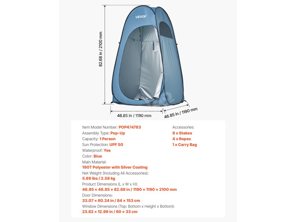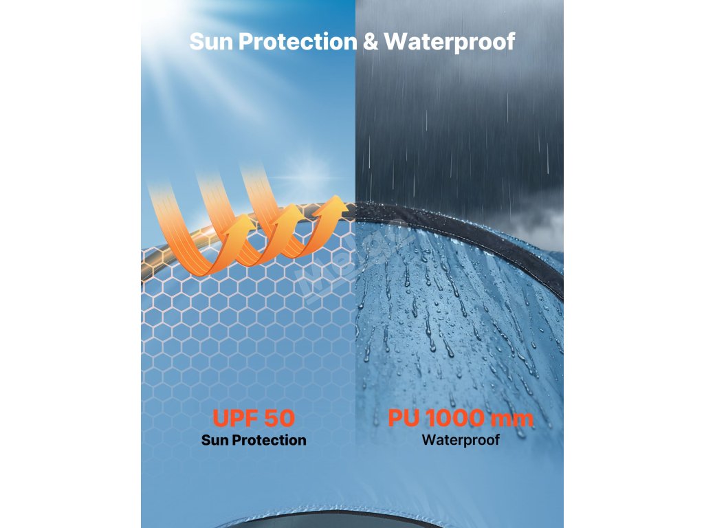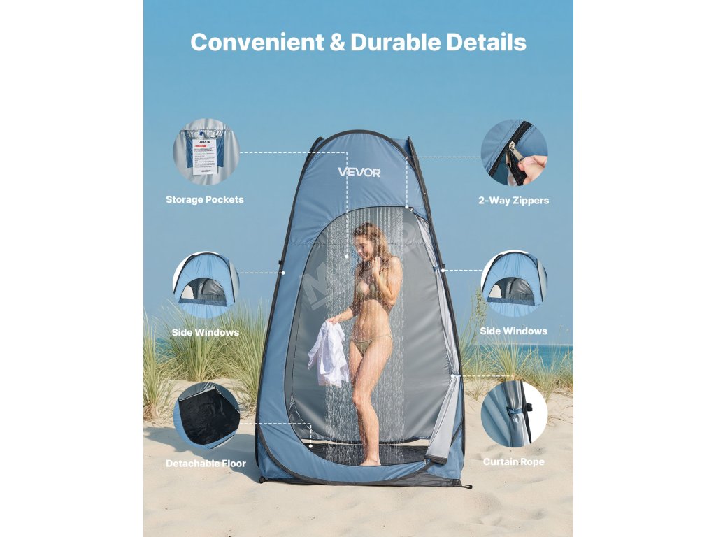 Náš skládací sprchový stan je vyroben z materiálu s ochranou proti slunci UPF 50 a voděodolné tkaniny PU2000mm, která chrání před sluncem a deštěm na pláži nebo při kempování a udržuje vnitřní prostor suchý a pohodlný.