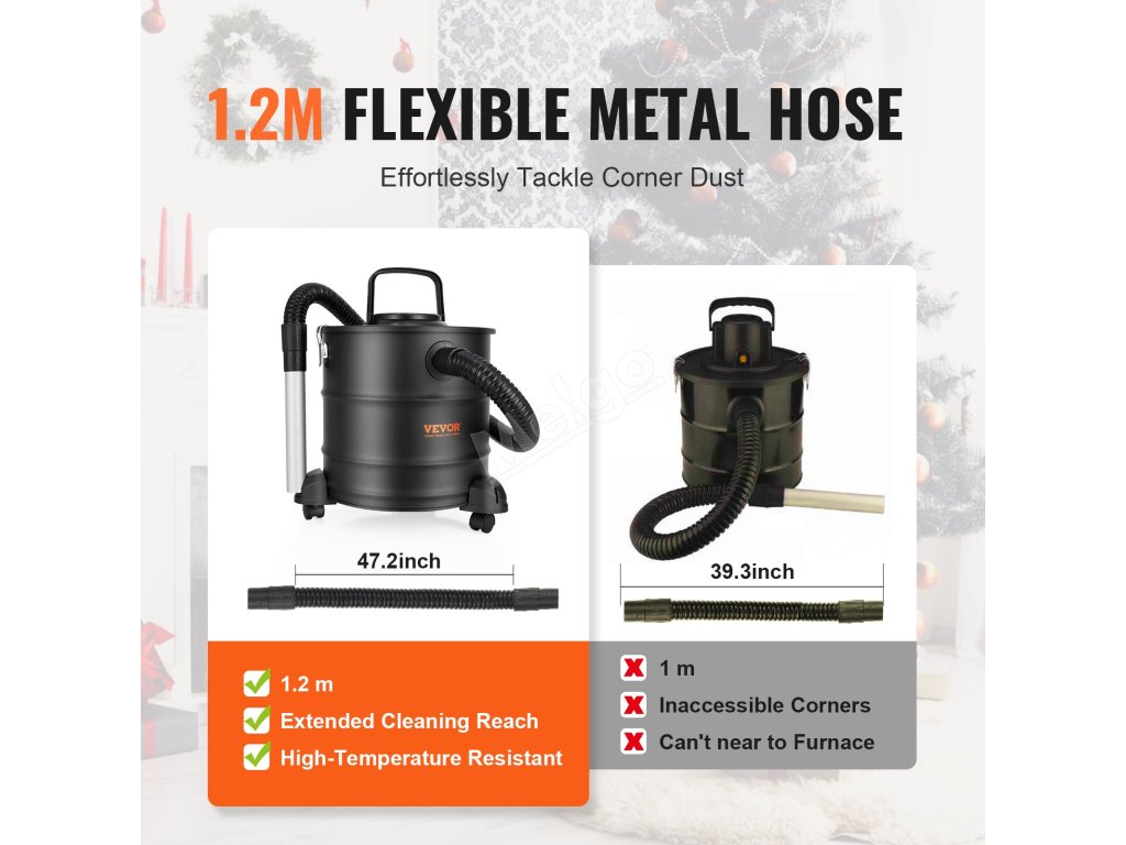 Kovová hadice odolná vůči vysokým teplotám, vhodná pro manipulaci s horkými částicemi. S délkou 47,2 palce (1,2 m) rozšiřuje dosah čištění a bez námahy dosáhne do každého rohu.