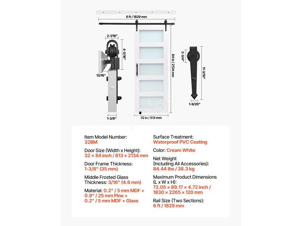 | Rozmery dverí (šírka x výška) | 32 x 84 palcov / 813 x 2134 mm |
