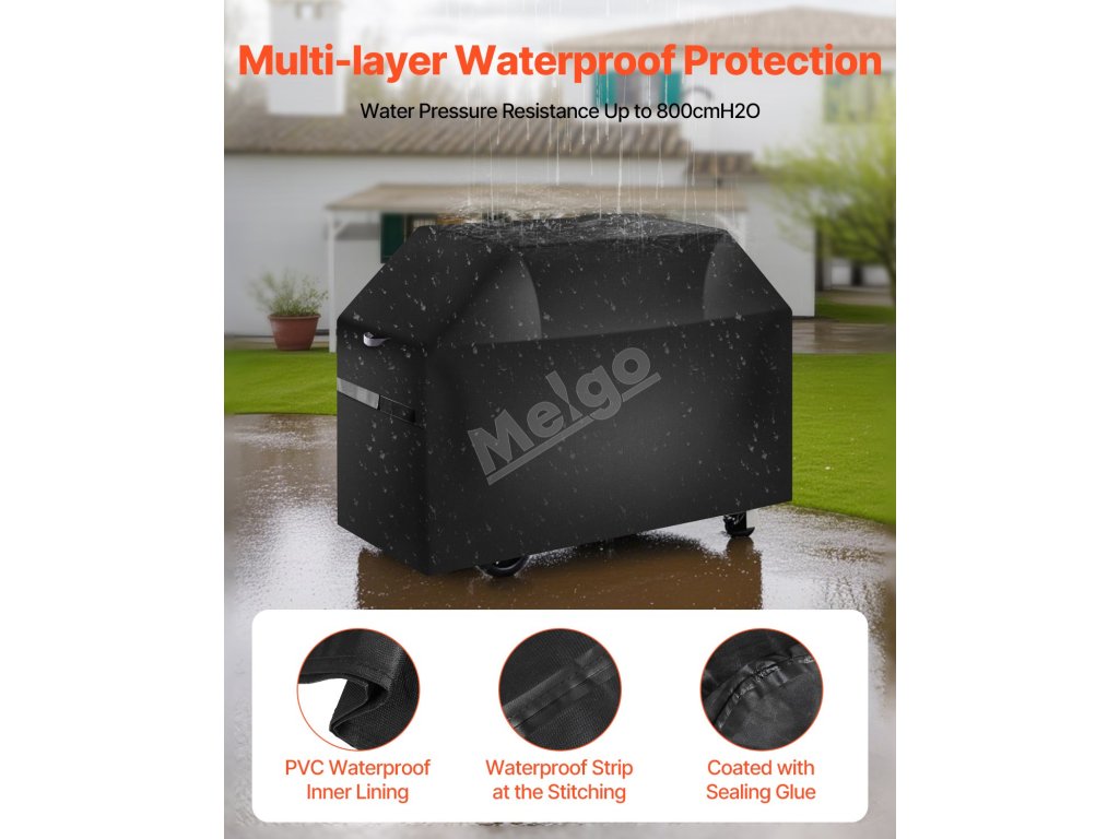 Vyrobeno ze 3 vrstev vysoce kvalitních materiálů: vrstva PVC, vrstva polyesterových vláken a nepromokavá vrstva. Tento kryt grilu zajišťuje odolnost proti vodě. Čtyři rohy jsou zesíleny, aby odolaly opotřebení. Šití je pevně utkáno, aby se zvýšila vodotěsnost.