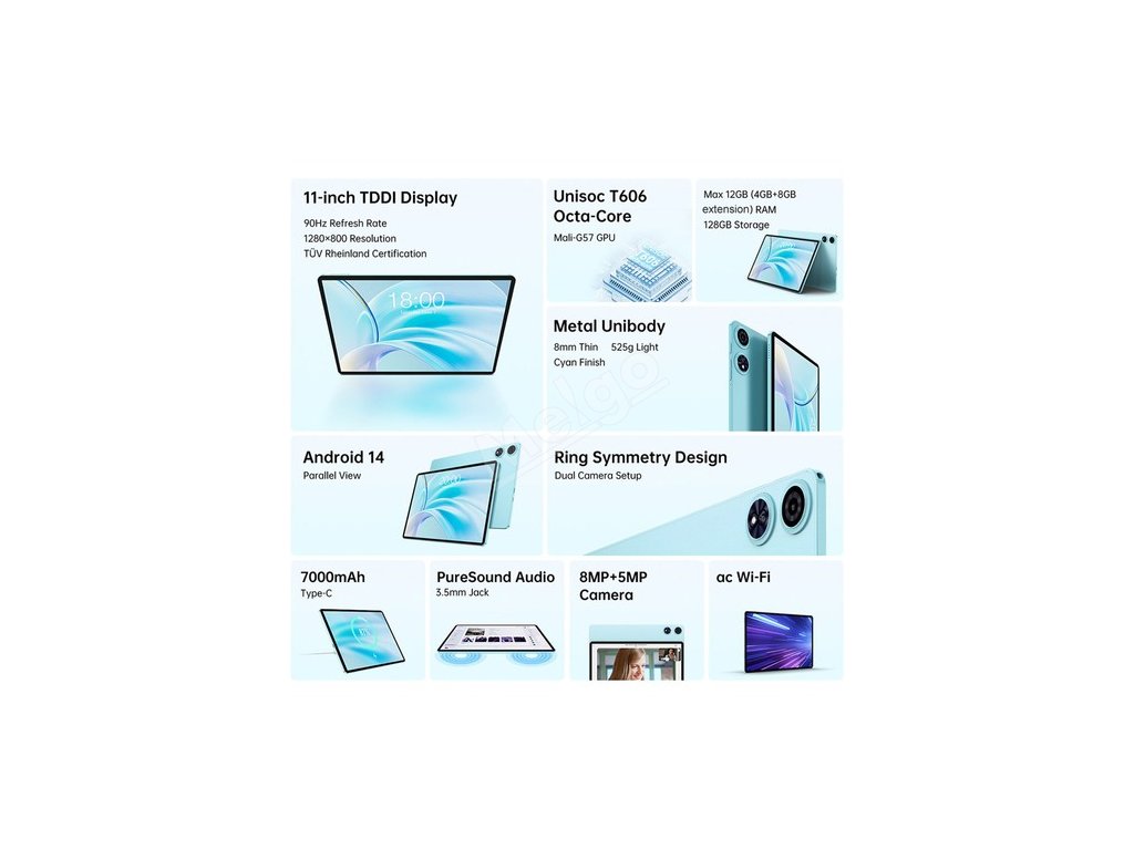 Pouzdro Teclast P50 pro Android 14 Tablet 11" UNISOC T606 Octa-Core 4GB + 8GB 128GB ROM 2.4/5GHz WiFi Bluetooth 5.0 7000mAh 5MP + 8MP GPS/Galileo/GLONASS/BDS
