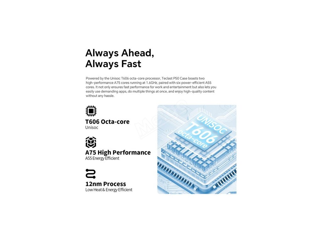 Tablet Teclast P50 Case Android 14 je vybaven osmijádrovým procesorem UNISOC T606, má dvě vysoce výkonná jádra A75 s frekvencí až 1,6 GHz a šest úsporných jader A55. To zaručuje nejen rychlý výkon pro práci a zábavu, ale také usnadňuje spouštění náročných aplikací, zvládání více úloh současně a snadné přehrávání obsahu ve vysoké kvalitě.