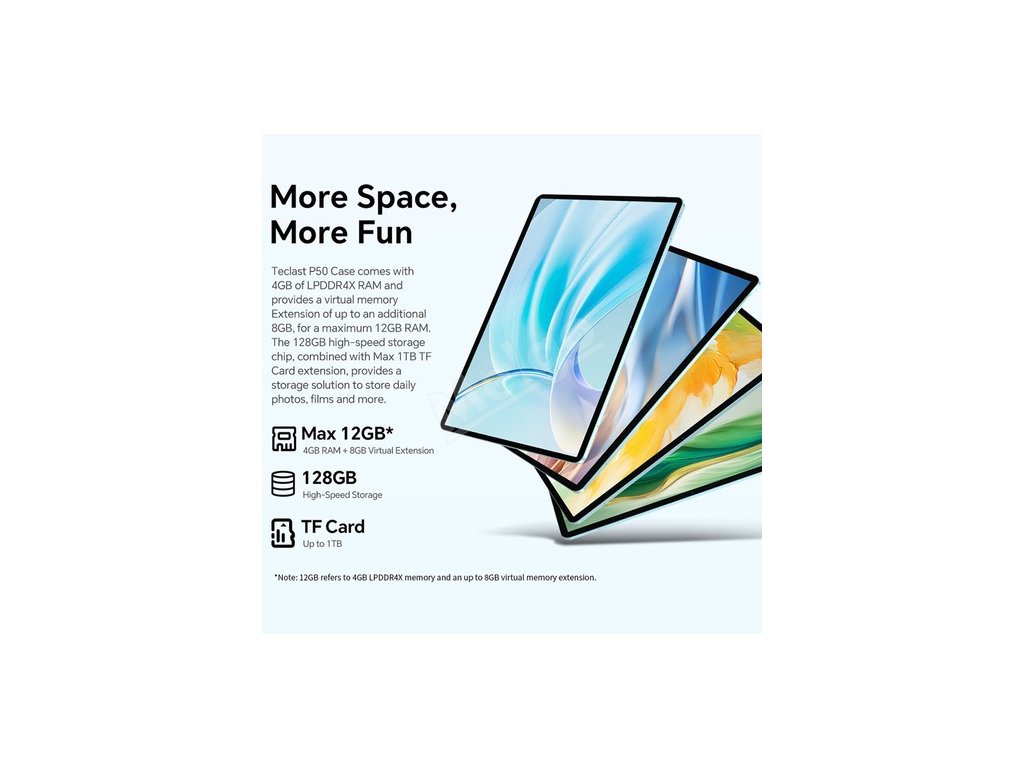 11palcový tablet Teclast P50 Case je vybaven 4 GB paměti LPDDR4X, poskytuje možnost rozšíření virtuální paměti až na 8 GB a podporuje až 12 GB paměti. Vysokorychlostní 128GB paměťový čip je spárován s kartou Micro SD s možností rozšíření až na 1 TB, což z něj činí ideální volbu pro ukládání každodenních fotografií, videí a dalšího obsahu.