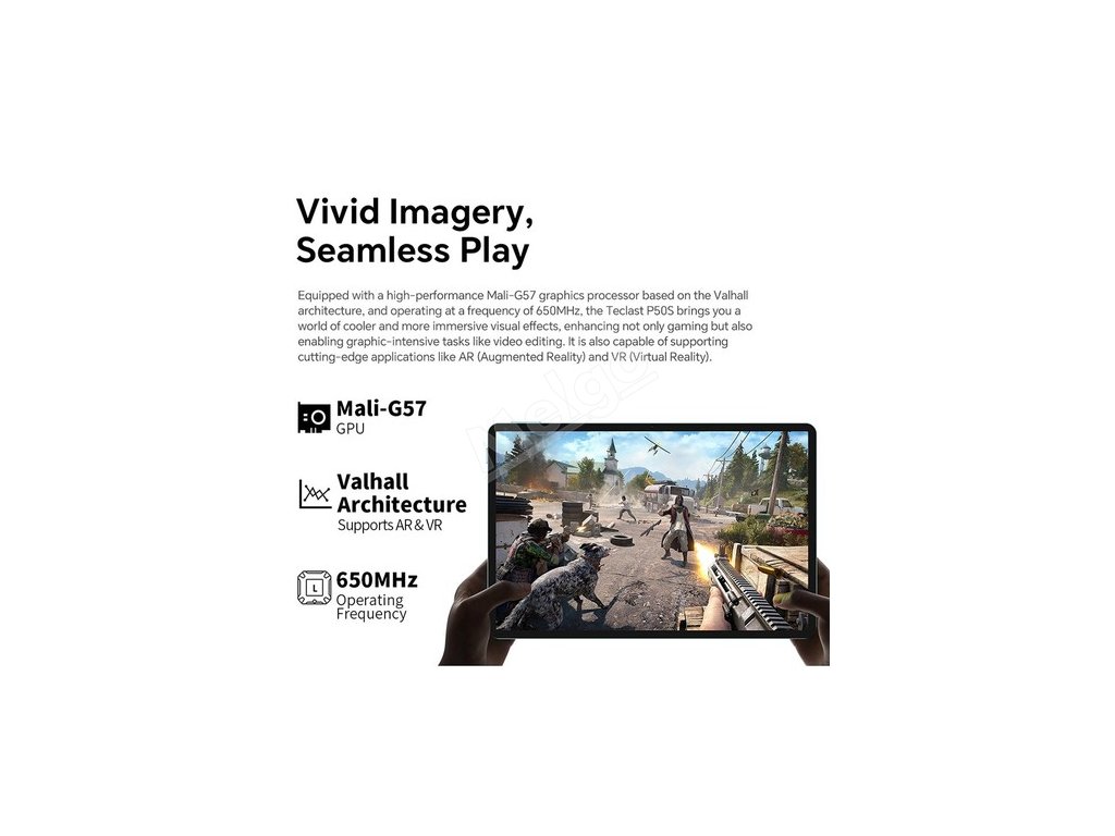 Pouzdro Teclast P50 je vybaveno 5Mpx přední kamerou, která je ideální pro videokonference a hovory a zajišťuje jasný a profesionální obraz. Působivý hlavní fotoaparát s rozlišením 8 Mpx, vybavený automatickým ostřením a doplněný sekundárním fotoaparátem Al pro optimalizaci obrazu, zvyšuje bezpečnost i celkový uživatelský zážitek.