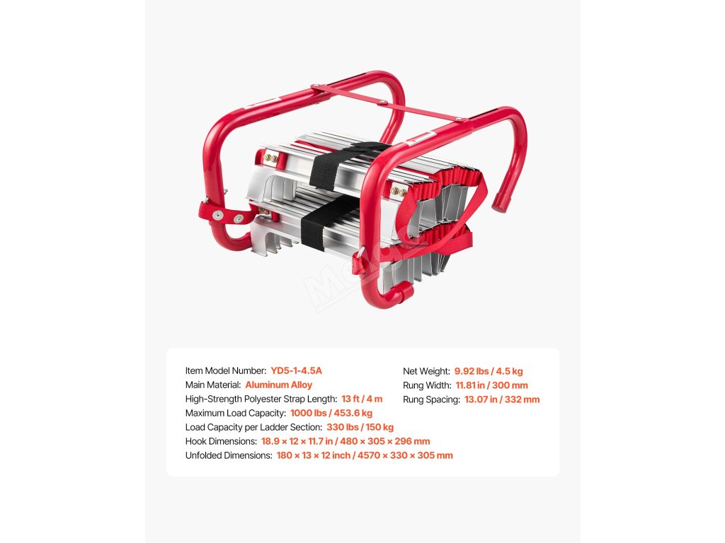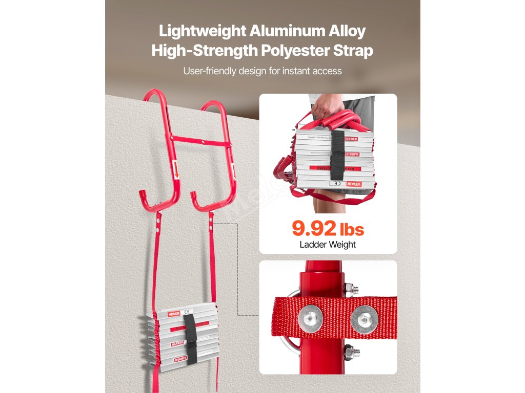 Dvoupatrový požární žebřík VEVOR je spolehlivým řešením pro únik z domu. Není třeba jej sestavovat - stačí jej rozložit a použít. Je vybaven 13stopým bezpečnostním popruhem, vysokou nosností 1 000 kg, středovou opěrou ve tvaru V, širokými stupni a protiskluzovými příčkami a zajišťuje bezpečný a stabilní sestup v případě nouze.