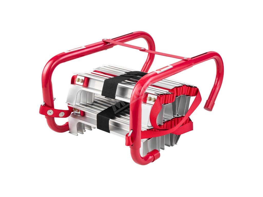 Tento únikový žebřík má centrální podpůrnou konstrukci ve tvaru písmene "V", která zajišťuje větší stabilitu a pevnost. Je vybaven robustními upevňovacími šrouby, 13 stop dlouhým polyesterovým popruhem s vysokou pevností a protiskluzovými příčkami žebříku, které zajišťují bezpečnější únik.
