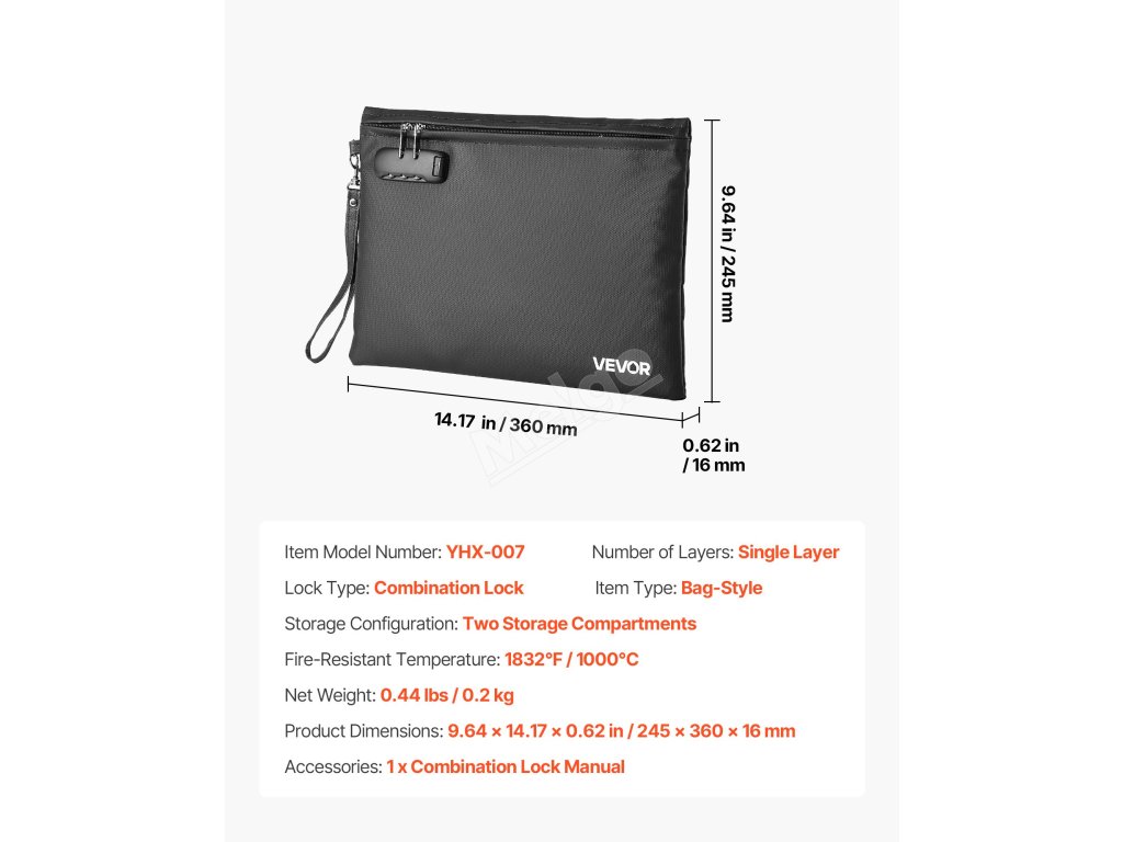 Tato ohnivzdorná taška vydrží 1832℉/1000℃ a udrží vodu a prach mimo dosah. Váží pouhých 0,44 lbs/0,2 kg a pomocí vrstveného designu uspořádá soubory a vybavení. Kombinovaný zámek a vodotěsný zip zvyšují bezpečnost cenností doma, v kanceláři nebo v autě.