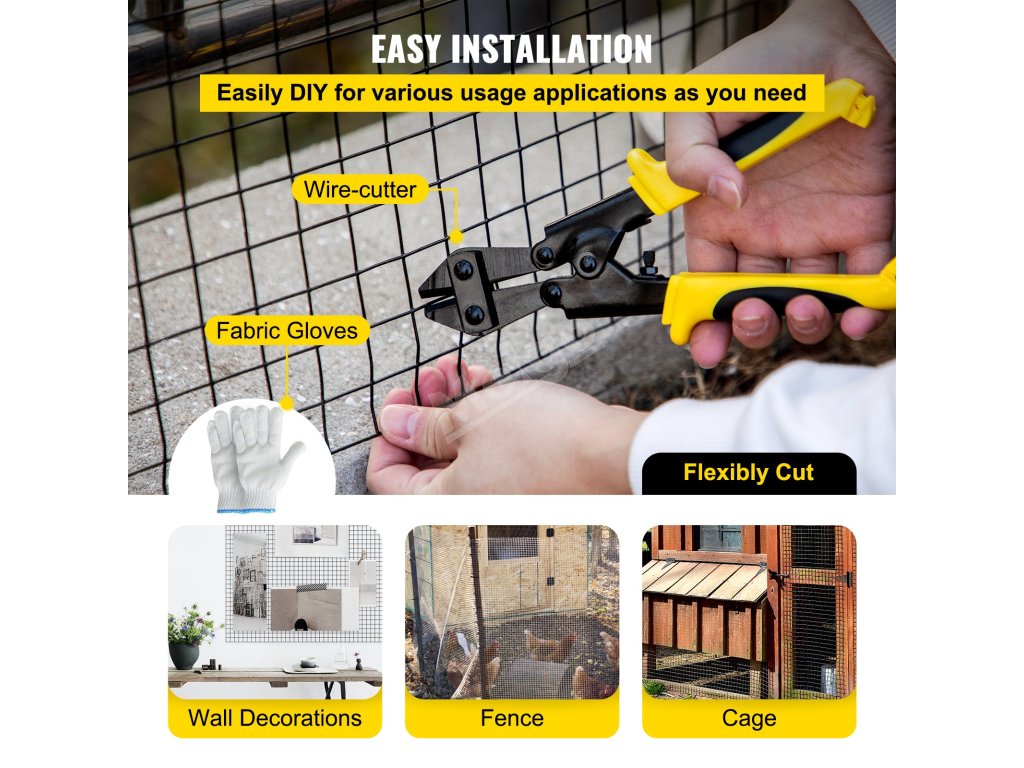 V našem balení najdete řezačku drátu a pár textilních rukavic pro snadnou a bezpečnou výrobu drátěného pletiva, které si můžete přizpůsobit podle svých potřeb.