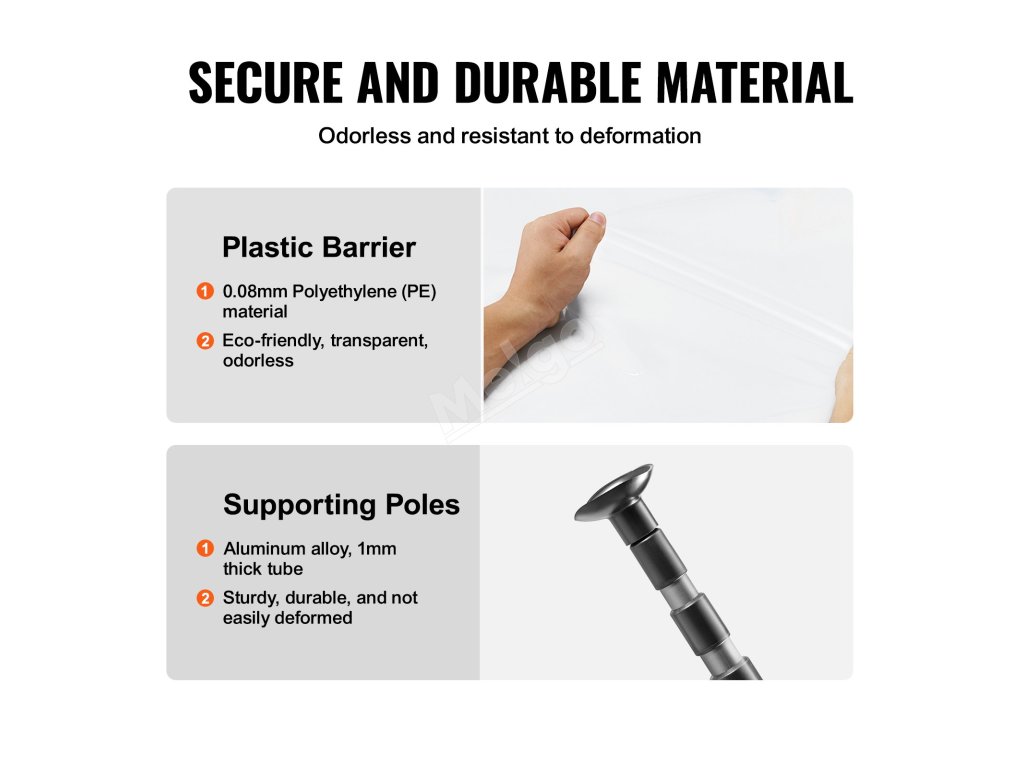 Plastová bariéra je vyrobena z 0,08 mm polyethylenu (PE), který je šetrný k životnímu prostředí a průhledný. Ve spojení s našimi nosnými tyčemi z hliníkové slitiny - jsou tu napořád; neopotřebovávají se.