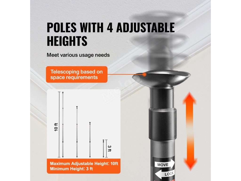 Tyče mají 4 nastavitelné výšky, dosahují výšky až 10 stop. Je vhodný pro různé prostorové požadavky.