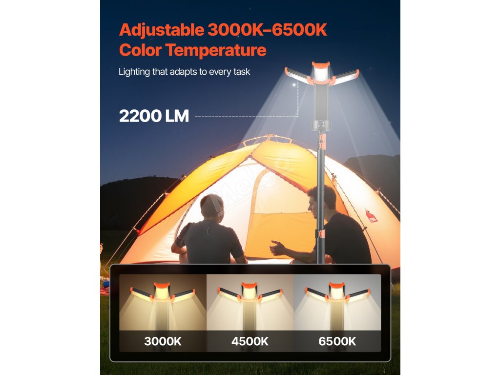Naše pracovní světlo LED se stojanem podporuje přepínání z teplé bílé 3000K na studenou bílou 6500K s nastavitelným jasem až 2200 lumenů. To pomáhá uspokojit nejrůznější potřeby, jako je noční práce, osvětlení dvora nebo vytvoření příjemného prostředí.