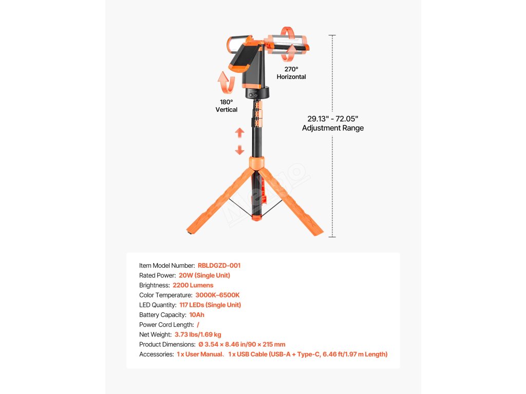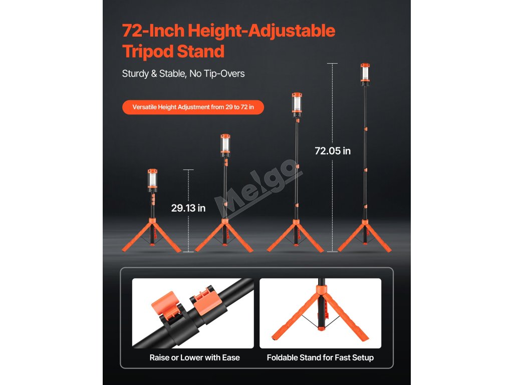 Díky skládacímu stojanu se stativem je pracovní světlo LED výškově nastavitelné a rychle se instaluje bez složitých kroků. Stativ podporuje flexibilní nastavení od 29,13 do 72,05 palce pro rychlé nastavení úhlů osvětlení.