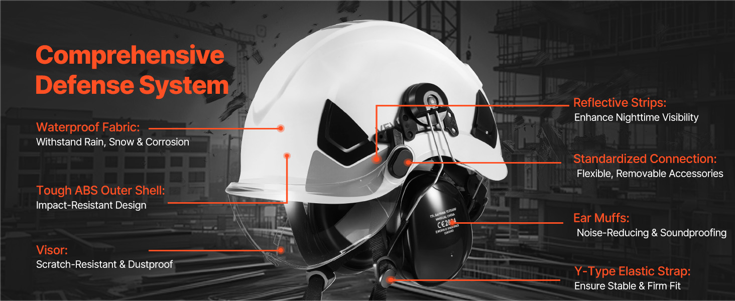 Pracovní přilba ABS 6-bodové upínání, clona a chrániče sluchu, Z89.1