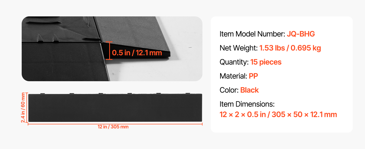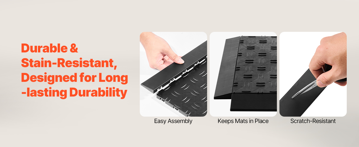 Tyto chrániče okrajů doporučujeme pro zámkové rohože. Toto příslušenství je navrženo speciálně pro garážové rohože VEVOR a pomáhá předcházet kroucení, posunu a usazování nečistot, čímž prodlužuje životnost rohoží.