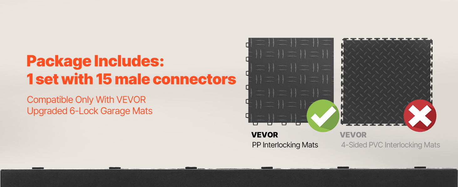 Kompatibilní se čtyřstrannými zámkovými PVC rohožemi VEVOR. Jedna sada chráničů okrajů poskytuje kompletní pokrytí pro 8 dílné čtyřstranné PVC zámkové garážové rohože.