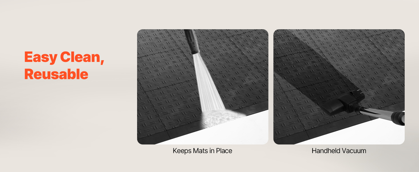 Čištění je snadné. Povrch této sady garážových dlaždic udržujte čistý a připravený k použití pomocí mopu nebo hadru, případně vysavače.