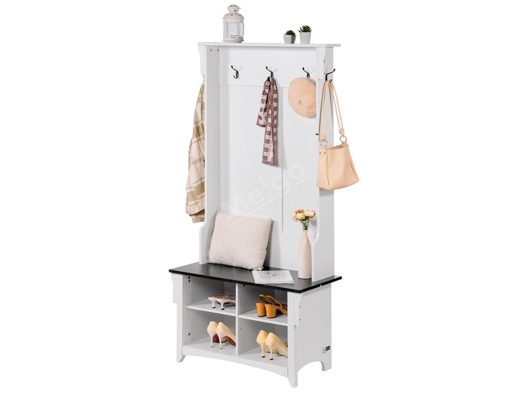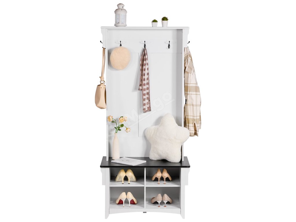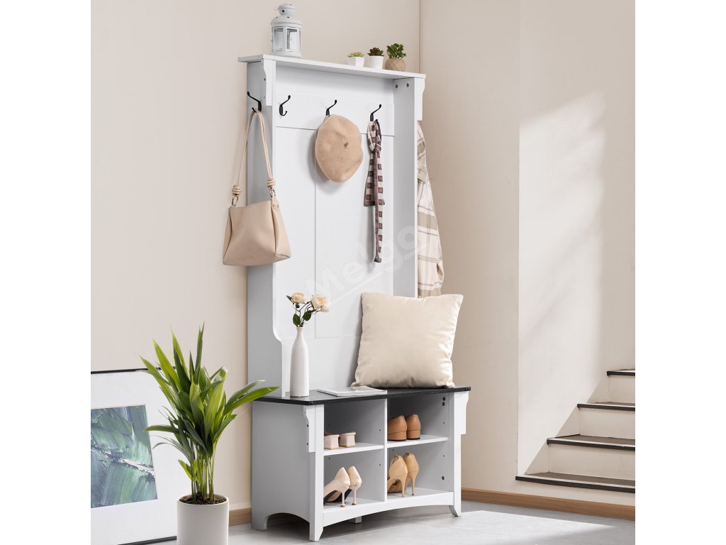 Předsíňový věšák s lavicí, 5 háčků, 4 zásuvky, do předsíně bílý