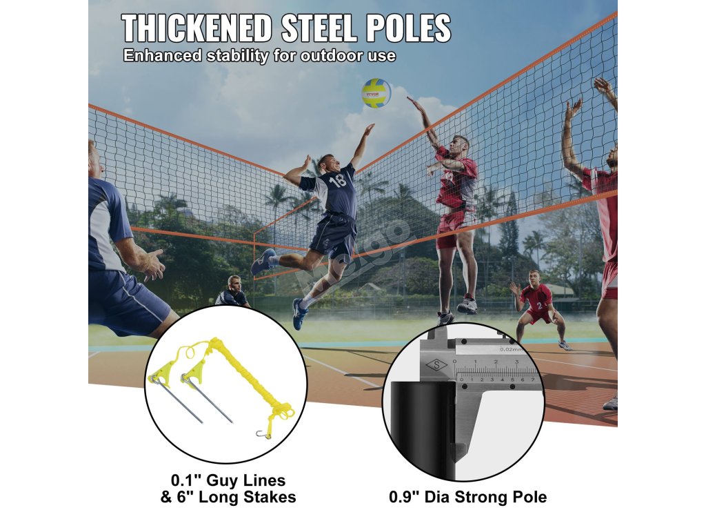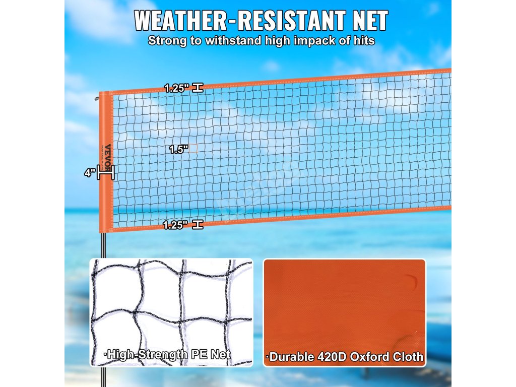 Tento venkovní přenosný systém volejbalové sítě je navržen tak, aby odolával povětrnostním vlivům, a je konstruován pro dlouhou životnost. Může se pochlubit vysoce pevnou PE síťovinou a odolnou tkaninou 420D oxford, díky čemuž odolá silným nárazům při tvrdých úderech.