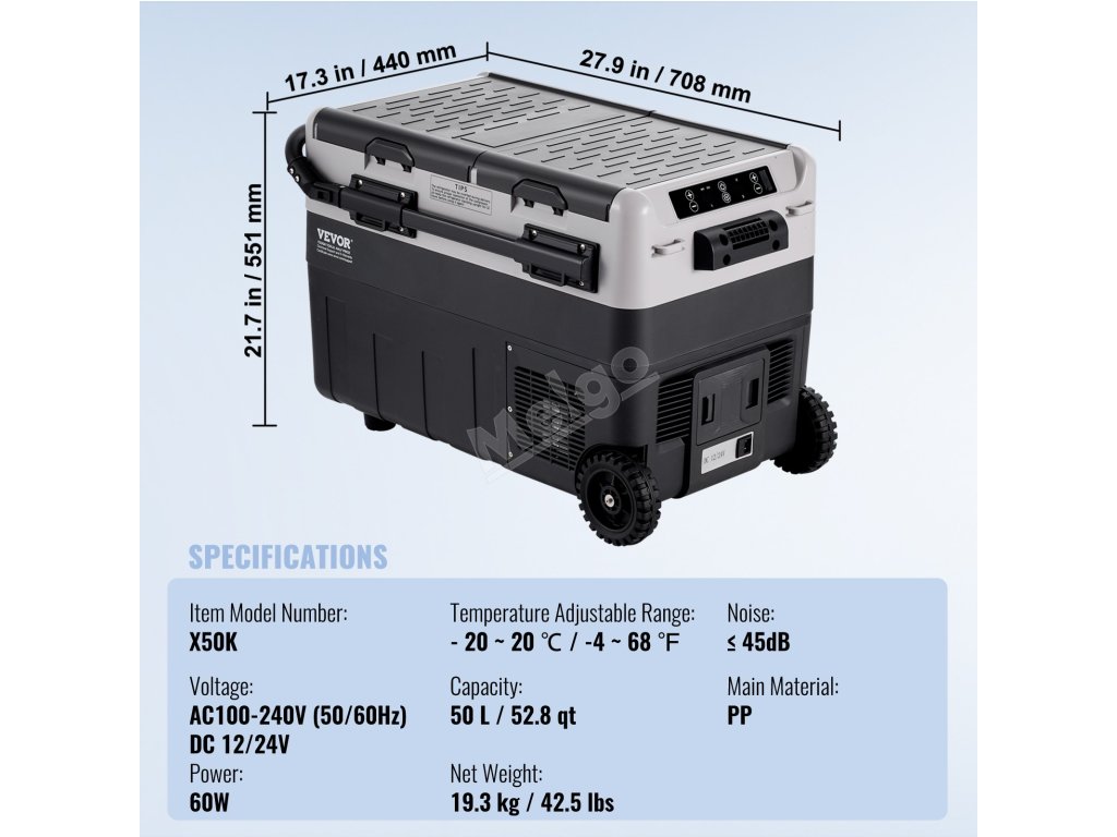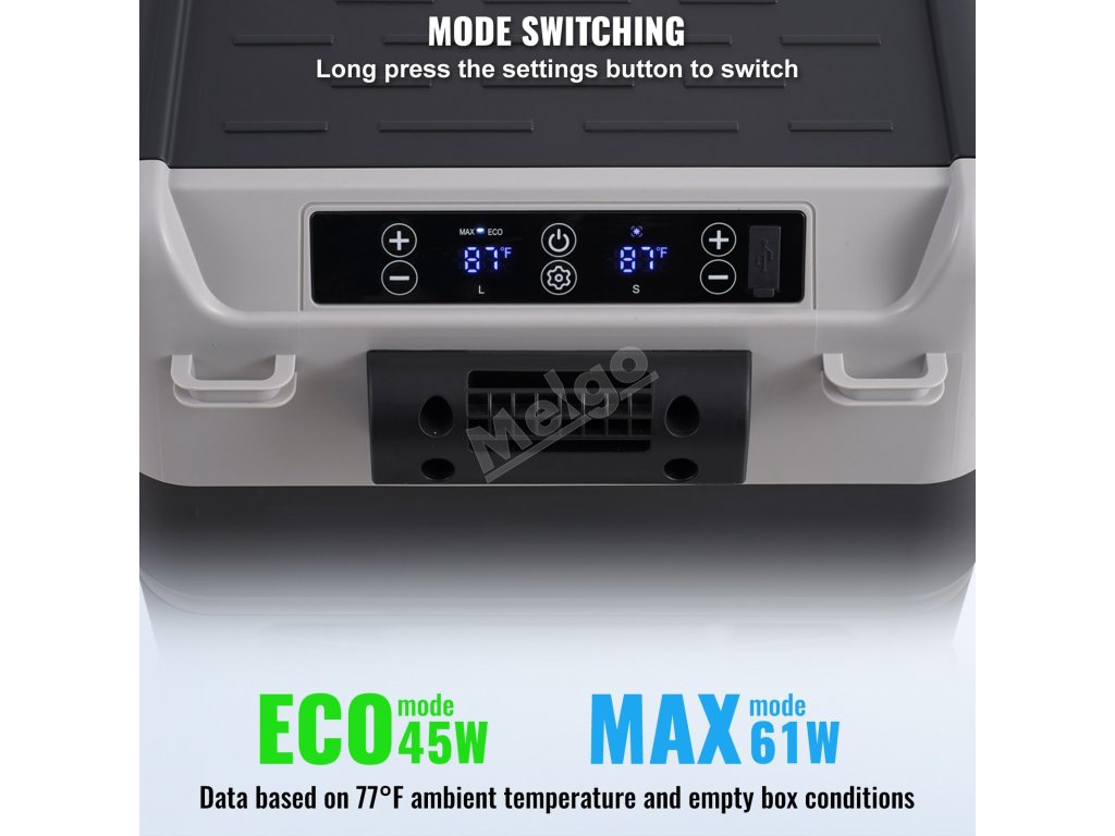 50 l / 52,8 qt autochladnička s vylepšeným kompresorem pro rychlé chlazení za 2 hodiny, schopná skladovat při vysokých i nízkých teplotách, udržující vynikající provoz v rozmezí 16 ~ 38 ℃/60,8 ~ 100,4 ℃.
