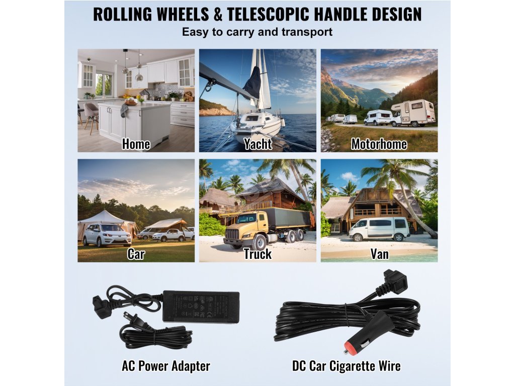 Je vybaven adaptérem, kabelem do zapalovače cigaret a napájecím kabelem a lze jej používat doma, na jachtách, v obytných vozech, osobních a nákladních automobilech a dodávkách.