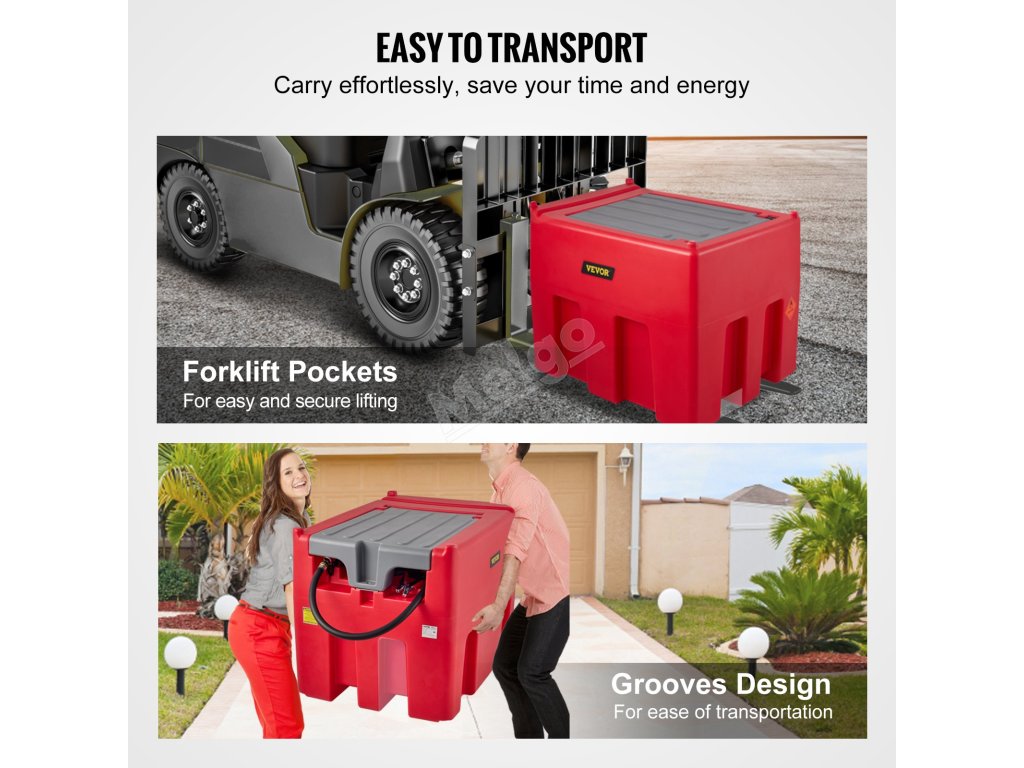 Dodává se se 2 drážkami a kapsami pro vysokozdvižný vozík pro snadný a bezpečný přesun nádrže s naftou. Integrovaná konstrukce vaku pro vysokozdvižný vozík se pohybuje, když je nádrž plná, a pohodlné drážky pro snadné zvedání.