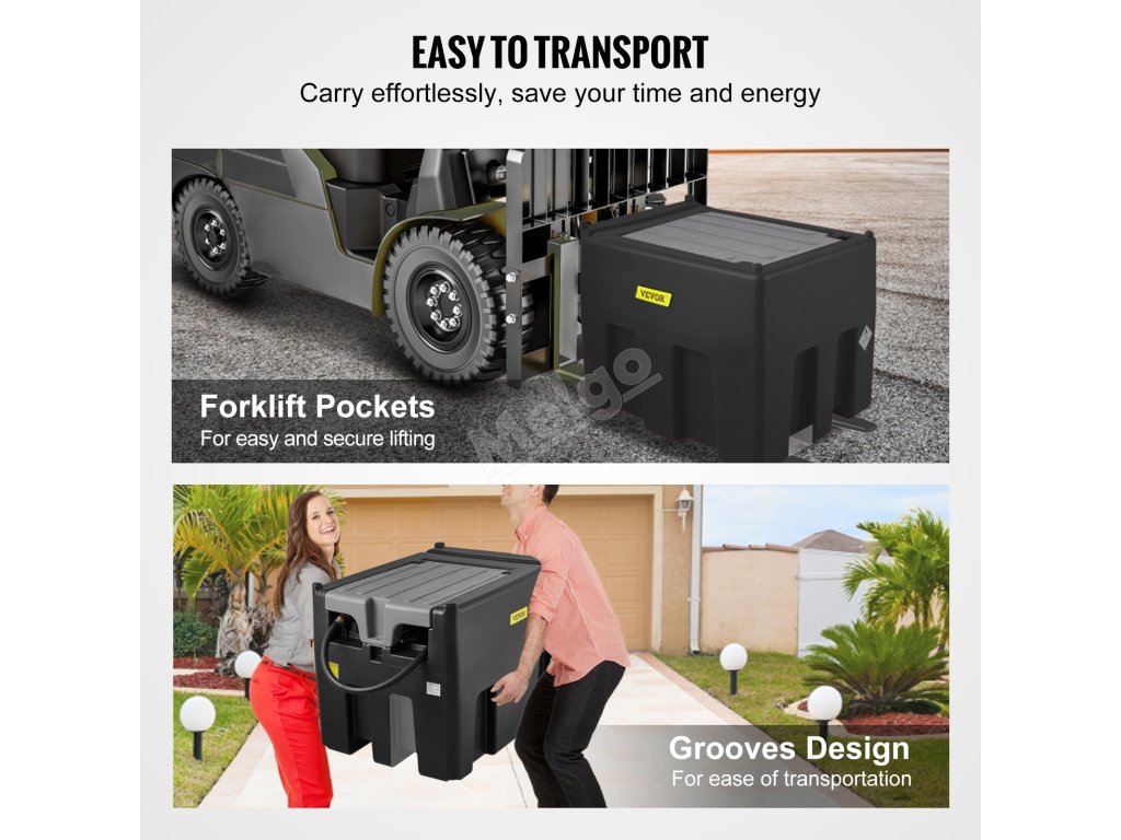 Dodává se se 2 drážkami a kapsami pro vysokozdvižný vozík pro snadný a bezpečný přesun nádrže s naftou. Integrovaná konstrukce vaku pro vysokozdvižný vozík se pohybuje, když je nádrž plná, a pohodlné drážky pro snadné zvedání.