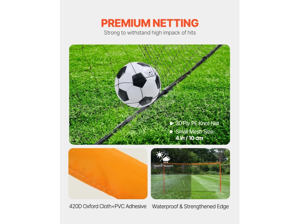 Naše fotbalová branka je vyrobena z prvotřídní PE síťoviny s robustní 30vrstvou uzlovou konfigurací. Tato síť nejenže vykazuje výjimečnou odolnost, ale je také vyztužena tkaninou 420D oxford a PVC lepidlem, takže je voděodolná a zároveň jsou její okraje zpevněné.