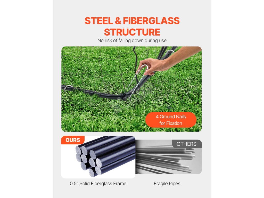 Fotbalová síť je vyrobena z pevného 0,5palcového rámu ze skleněných vláken doplněného robustními ocelovými komponenty. Spolu se šesti zemními kolíky pro bezpečné ukotvení nehrozí, že by se branka při intenzivním používání zřítila.