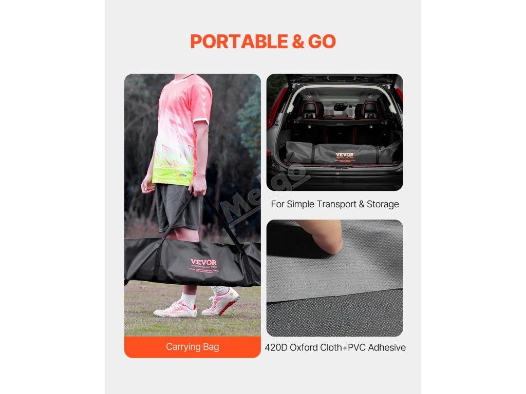 Naše tréninková fotbalová branka je vyrobena pro pohodlí a mobilitu a obsahuje praktickou tašku na přenášení z tkaniny 420D oxford a PVC lepidla.