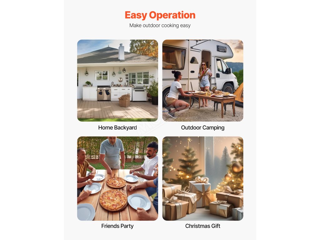 Přenosná pec na pizzu je lehká, vhodná pro venkovní použití. Lze ji snadno přenášet a kdekoli postavit, takže je ideální pro kempování, pikniky a další venkovní dobrodružství.