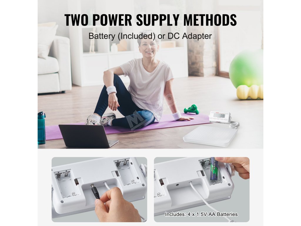 Tato lékařská váha nabízí dva způsoby použití - montáž na stěnu nebo na pult - je všestranná a pohodlná. Podporuje dvě možnosti nabíjení: bateriové napájení nebo stejnosměrný adaptér pro nepřetržité použití (se 4 bateriemi a stejnosměrným adaptérem, které jsou součástí dodávky).