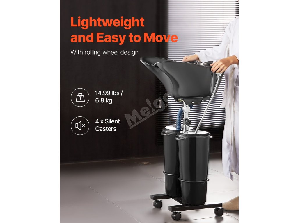 Přenosná salónní šamponovací mísa váží pouhých 6,8 kg a má konstrukci na kolečkách pro snadnou mobilitu. Lze ji rozložit a kompaktně uložit, což šetří místo a umožňuje pohodlné a bezproblémové používání.