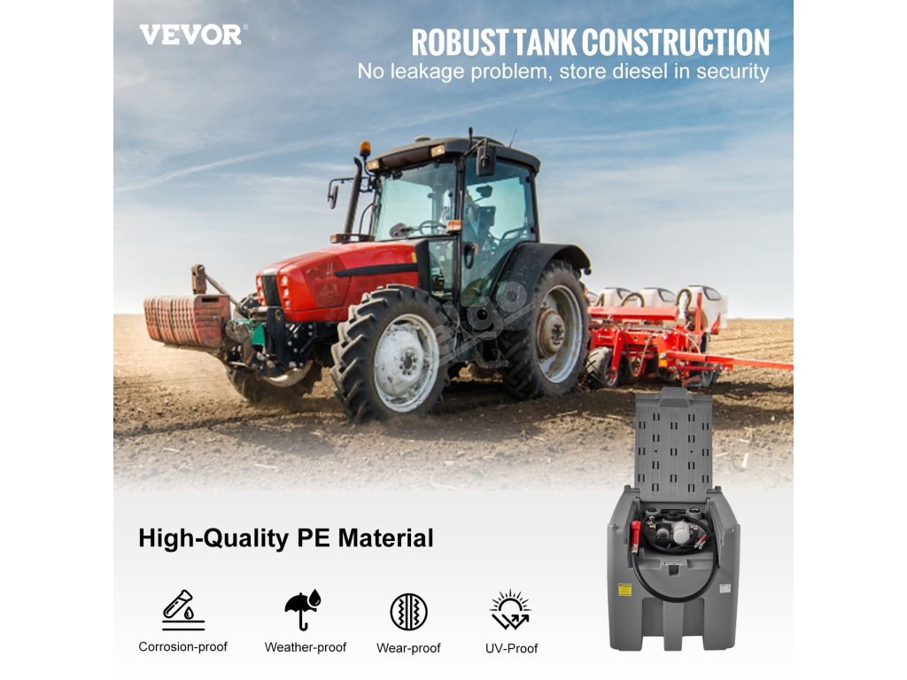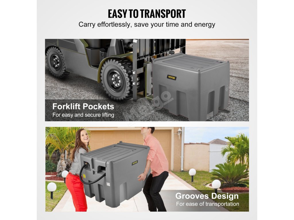 Dodává se se 2 drážkami a kapsami pro vysokozdvižný vozík pro snadný a bezpečný přesun nádrže s naftou. Integrovaná konstrukce vaku pro vysokozdvižný vozík se pohybuje, když je nádrž plná, a pohodlné drážky pro snadné zvedání.