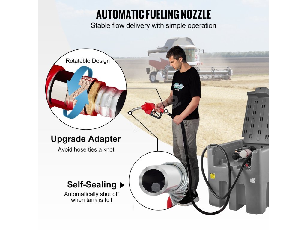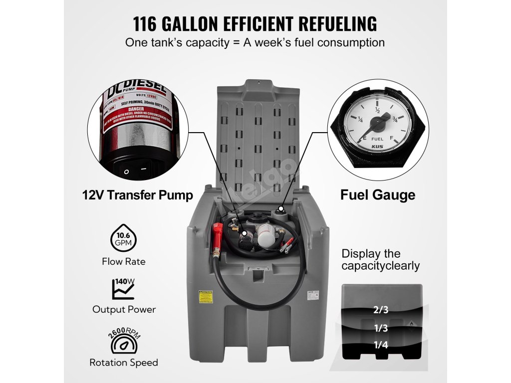 Přečerpávací čerpadlo na 12 V dodává palivo rychlostí 10,6 galonu za minutu, což je rychlejší a šetří váš čas i energii. Palivoměr je vybaven osmistupňovou stupnicí, která vám pomůže sledovat objem paliva a umožní vám včas doplnit palivo.