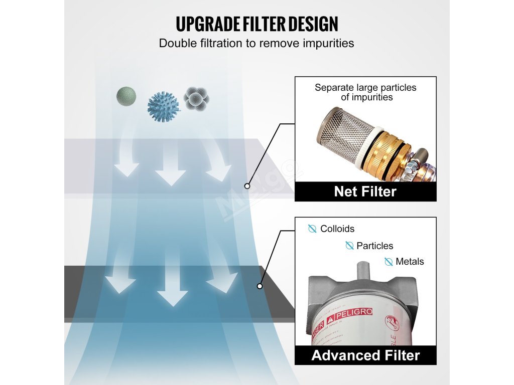 Vnitřní speciální filtr se sací síťkou a vnější pokročilý filtr filtrují nečistoty a malé částice ze dvou hledisek. Díky těmto vynikajícím konstrukčním řešením vám naše přenosná nádrž na naftu může poskytnout čistší palivo a zajistit lepší zážitek z tankování.