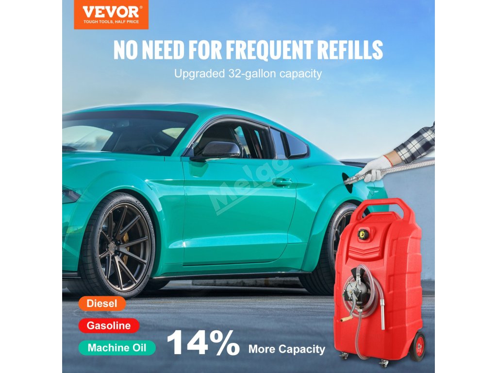 Přenosná nádoba na palivo na kolečkách je určena pro komerční i rekreační použití. Nádrž o objemu 25 galonů umožňuje uskladnit dostatek paliva pro více vozidel.