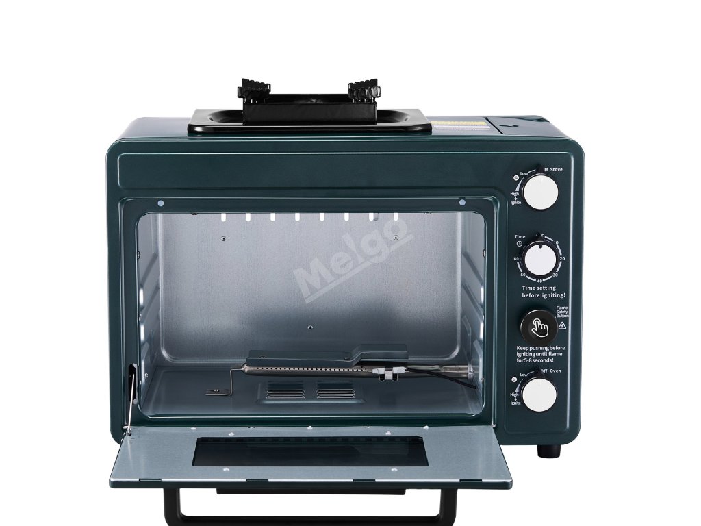 Skleněné okénko umožňuje kontrolovat stav pokrmu, aniž byste museli otevírat dvířka trouby, což pomáhá udržet teplo a zvýšit účinnost pečení. Bezpečnostní tlačítko plamene zajišťuje bezproblémové vaření.