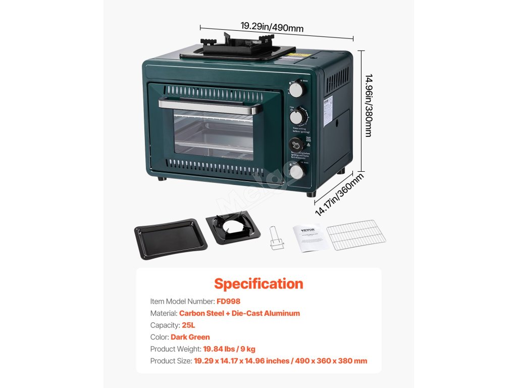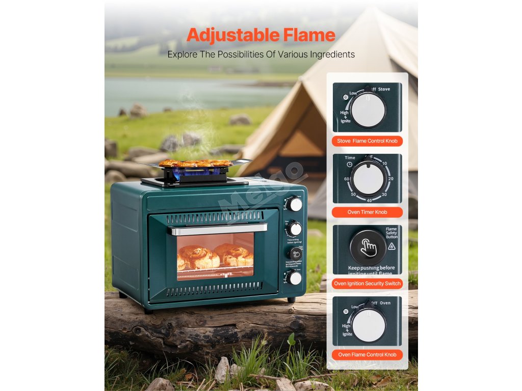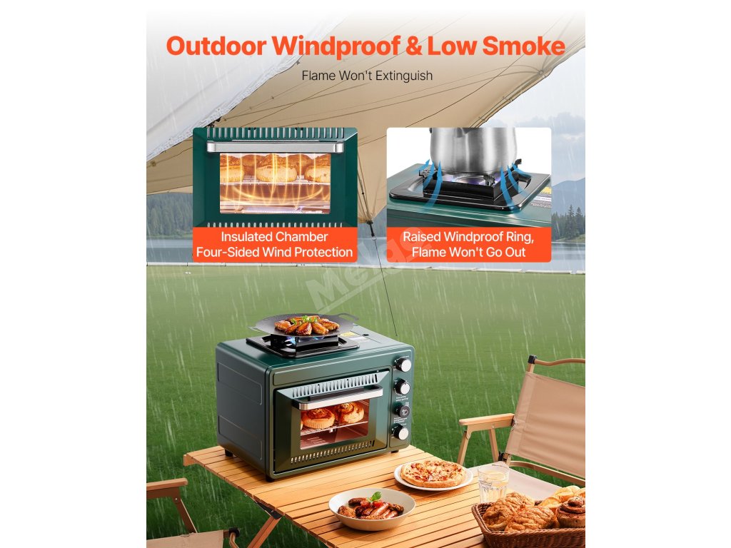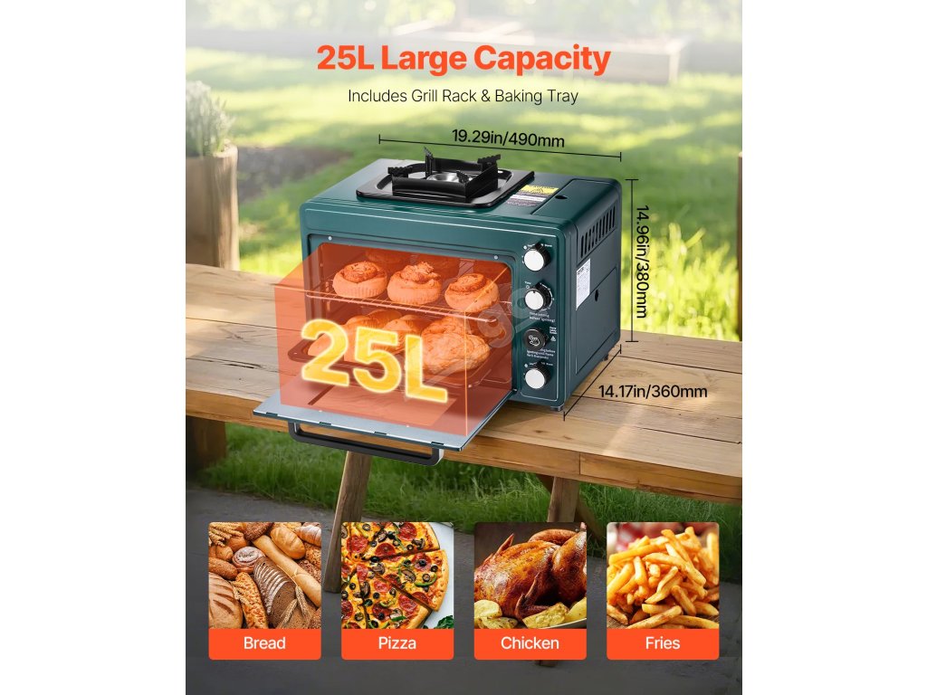 Tato venkovní trouba s kombinovanou konstrukcí trouby a varné desky o rozměrech 19,29 x 14,17 x 14,96 palce zajišťuje flexibilní a efektivní vaření. Umožňuje nastavitelnou regulaci plamene a je vybavena 60minutovým časovačem, takže ji nemusíte neustále sledovat.