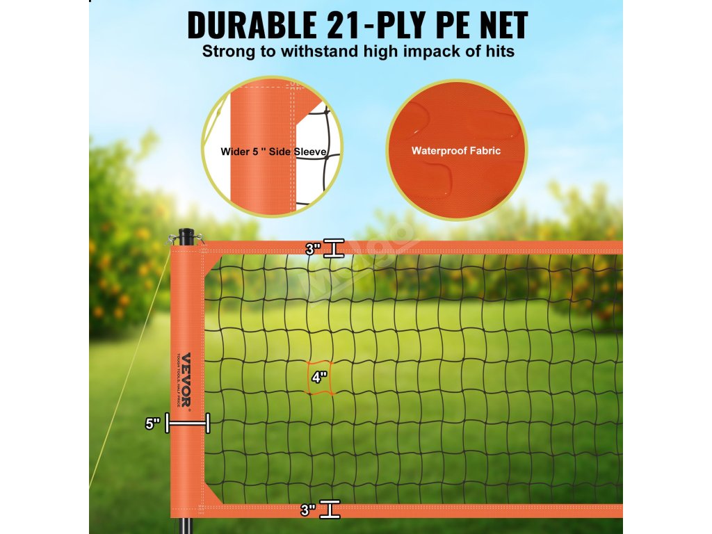 Tato síť vyrobená z pružného 21vrstvého PE materiálu zaručuje výjimečnou odolnost a delší životnost. Její širší konstrukce bočních rukávů a nepromokavá tkanina jsou ideální pro venkovní použití a jsou schopny odolat silným nárazům během intenzivních zápasů.