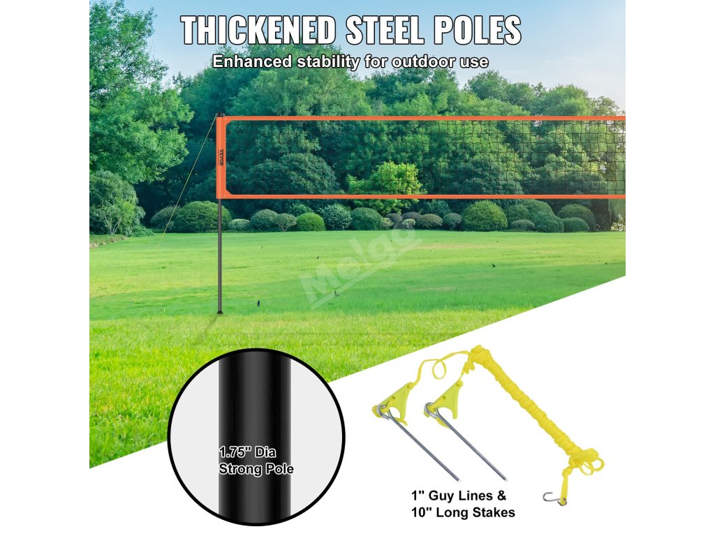 Sada volejbalové sítě obsahuje zesílené tyče, které zajišťují stabilitu, zejména ve venkovním prostředí. Tyto tyče jsou navrženy tak, aby odolaly různým povětrnostním podmínkám a zajistily stabilní a bezpečnou hru.